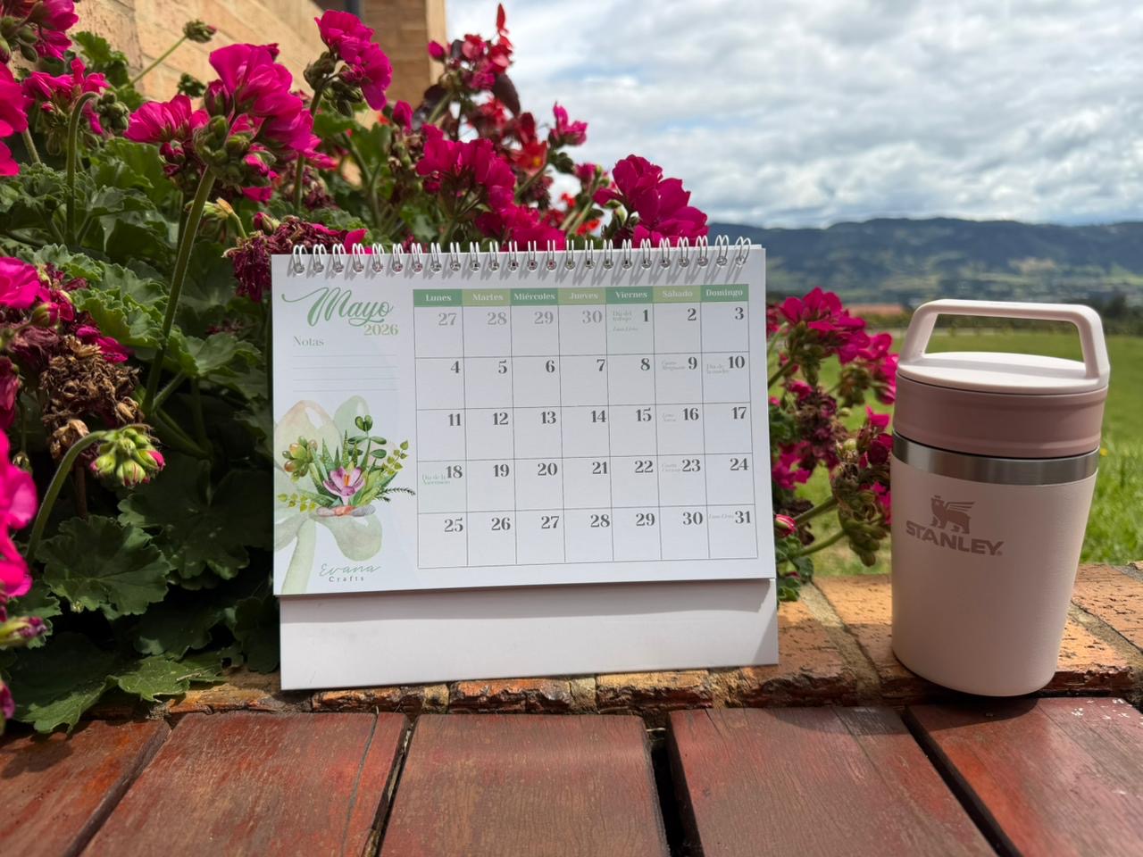 Calendario 2026 Evana Crafts, calendario de escritorio fechado y con festivos de Colombia, con espiral, ilustraciones florales variadas mes a mes, tamaño 21.5cm x 15cm, calendario anual 2026 y 2027,
